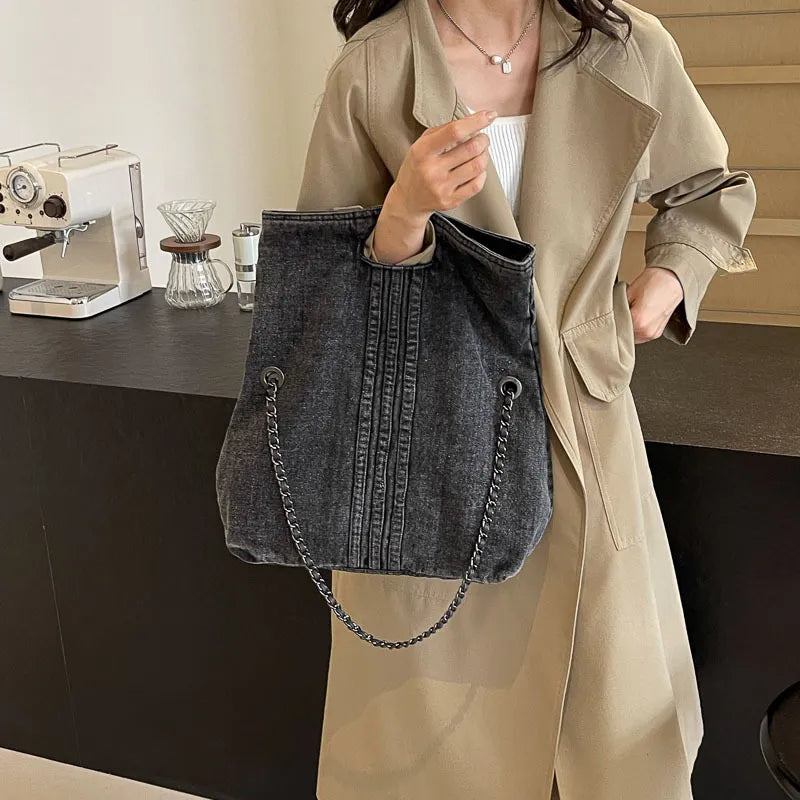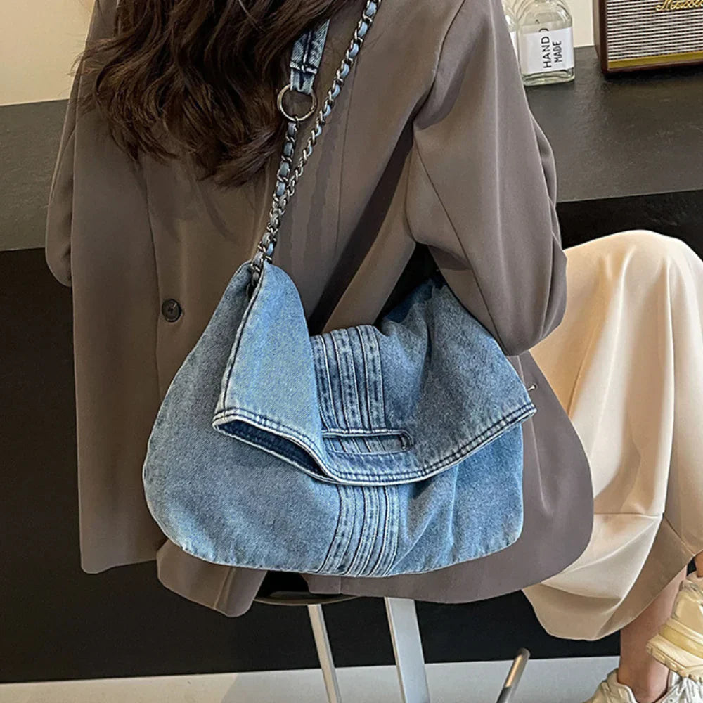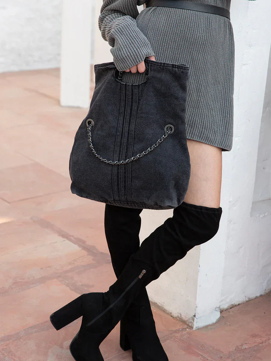 Adele er en trendy skulderveske som kombinerer en myk denimlook med elegante kjededetaljer. Perfekt for deg som ønsker en avslappet, men samtidig sofistikert stil.