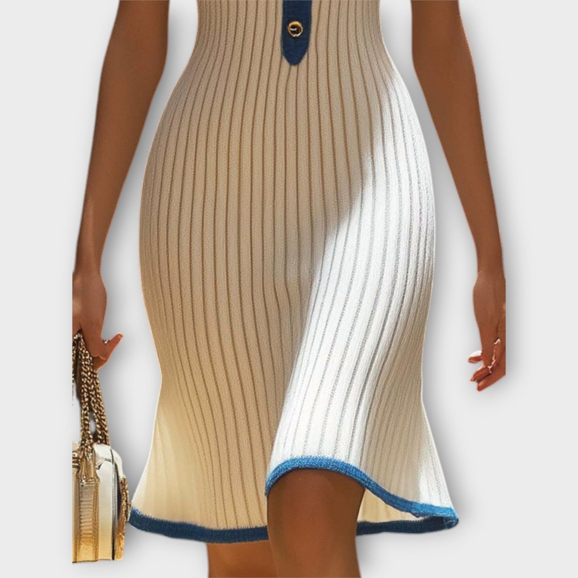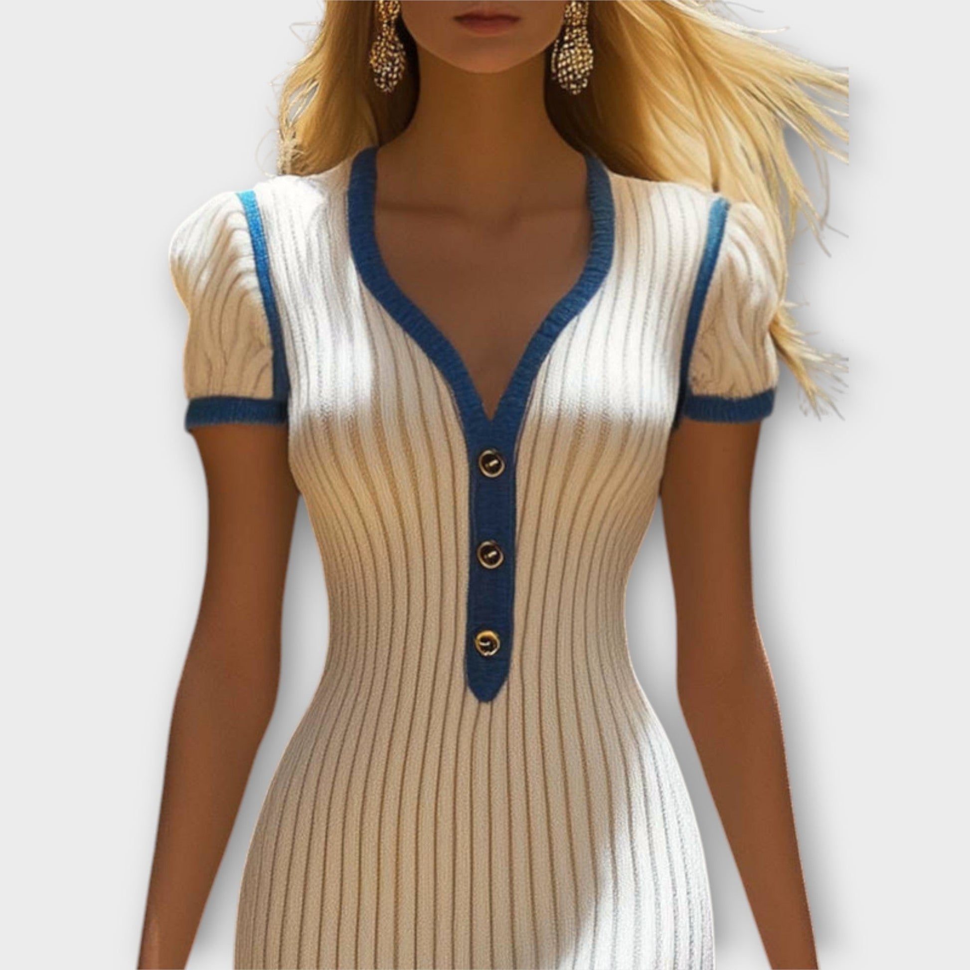 Åsnyra er skapt for deg som ønsker en kjole som sitter flatterende og samtidig føles behagelig. Den ribbestrikkede strukturen fremhever silhuetten, mens knappene i front og kontrastkantene gir et stilfullt uttrykk. Perfekt både til hverdags og kveldsbruk.