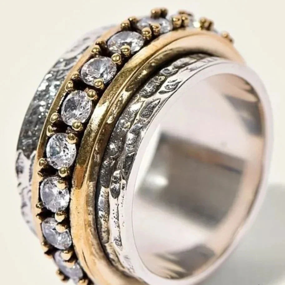 Berenice To-Farget Zirconia Ring fanger essensen av kongelig eleganse med sine fint detaljerte inlagte zirconia-stener og en grasiøs blanding av gull og sølvtone. Omhyggelig laget av premium, langvarige metaller, denne vintage-inspirerte delen skinner med luksuriøs sjarm. Enten den brukes som en statementring eller lagd med andre favoritter, Berenice gir en raffinert glød til enhver smykkekolleksjon.