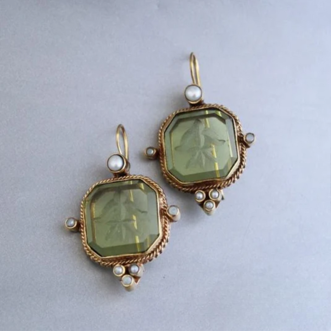 Dagny-øredobbene er utformet med fasetterte grønne steiner innrammet i gullfarget metall, pyntet med små perledetaljer. Designet gir en følelse av ro og eleganse, perfekt for deg som ønsker et smykke som er både tidløst og unikt.