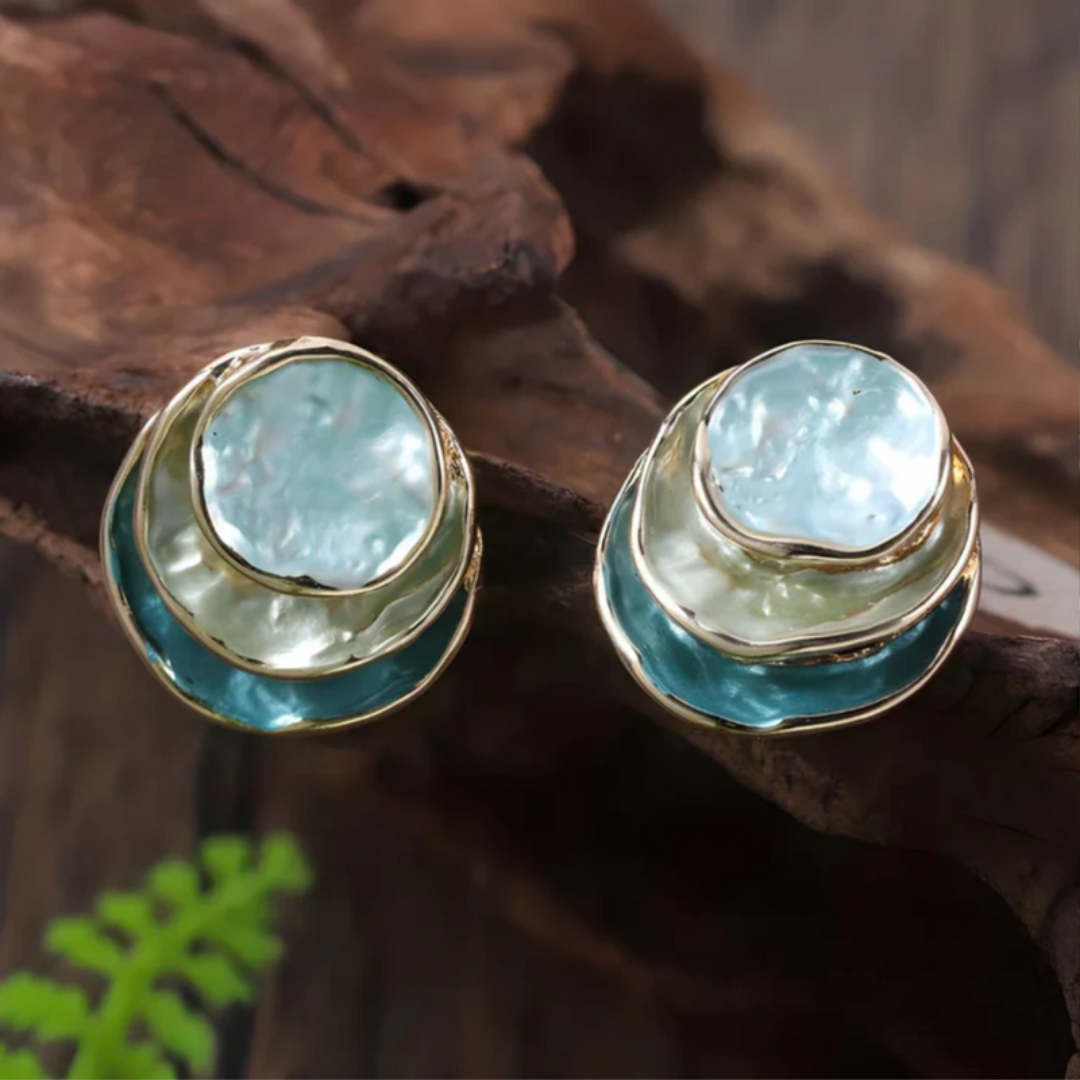 Eline-øredobbene er laget med lagdelte sirkler i blå og perlemorshvite toner, innrammet i gull. De glitrende overflatene gir et spill av lys som minner om bølger i solskinn. Perfekte for deg som ønsker et friskt, men elegant uttrykk.