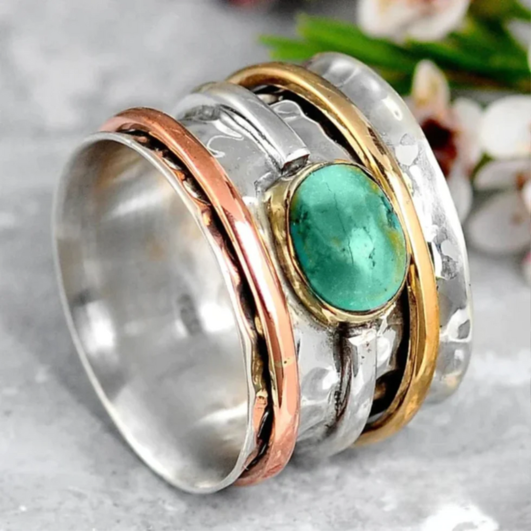 Hedda-ringen er laget i sølv med detaljer i gull og kobber, som skaper en varm kontrast til den grønne turmalinsteinen i midten. Den hamrede overflaten og de varierte metallene gir et robust og samtidig elegant uttrykk.