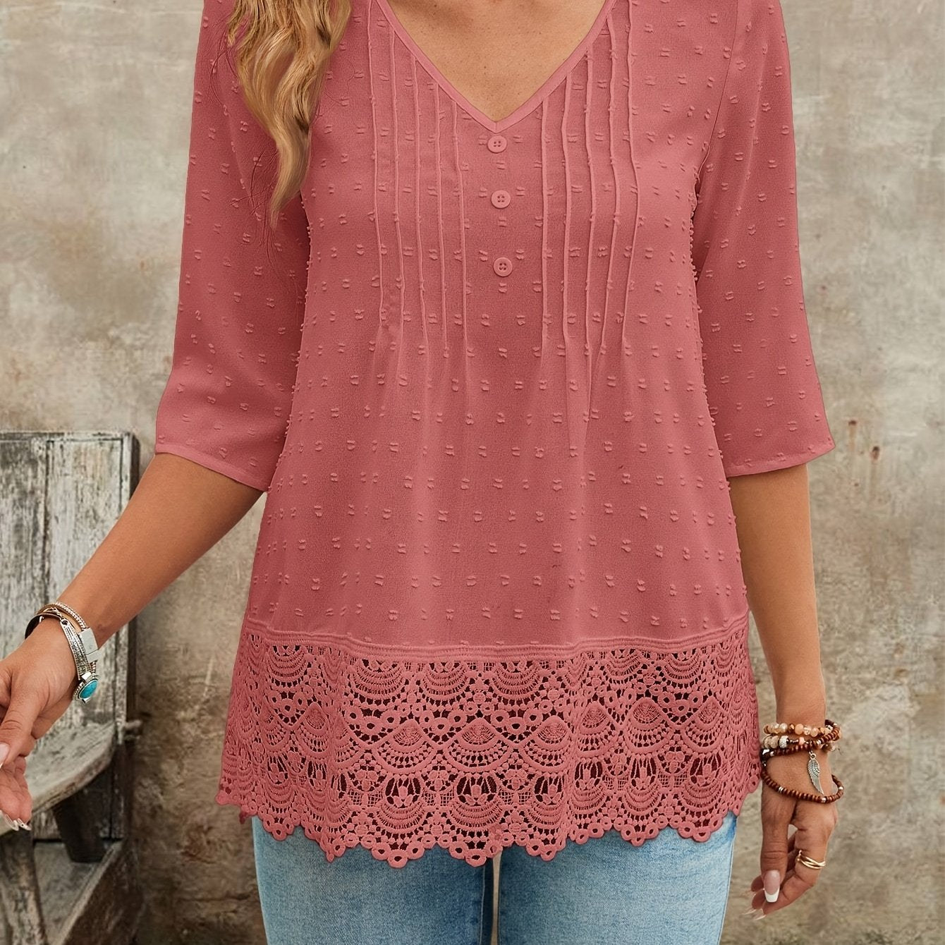 Jytte-toppen kombinerer klassiske detaljer med myk komfort. Den lette strukturen i stoffet, dekorative knappene og den elegante V-halsen gir et sofistikert uttrykk, mens den brede blondekanten nederst setter prikken over i-en. Perfekt for både hverdag og små anledninger der du vil føle deg litt ekstra fin – uten å ofre komforten.