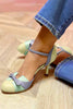 Kårhild kombinerer vintageinspirert design med et friskt fargevalg. Med tofarget skinn, slank ankelstropp og sjarmerende sløyfe foran, gir disse hælene deg et feminint og lekent preg – enten du skal på kafé med venner eller pynte deg til fest.