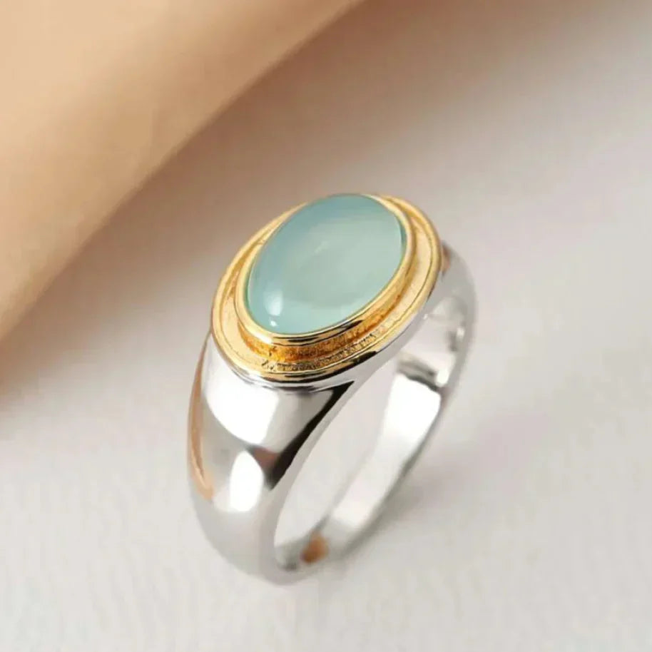 Den Livia Ringen fremkaller en følelse av mystikk og tidløs skjønnhet, med en lysende grønn månestene satt i en delikat laget sølvfarget ring. Inspirert av vintage-design, glitrer denne ringen med en etereal glød som skifter med hver bevegelse. Laget av høykvalitets, langvarige materialer, er Livia både et statement av eleganse og et symbol på varig sjarm. Enten den bæres daglig eller for spesielle øyeblikk, tilfører den et magisk preg til ethvert antrekk.
