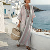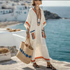 Denne flagrende kjolen gir uanstrengt eleganse til solfylte dager. Laget av lett stoff, har den en avslappet silhuett med livlige oransje detaljer og kontrasterende stripete lommer som fremkaller en strandferie. V-halsen og de vide ermene forsterker den boho-chic-følelsen, noe som gjør den til den perfekte følgesvennen for feriedagene eller avslappende spaserturer langs kysten.