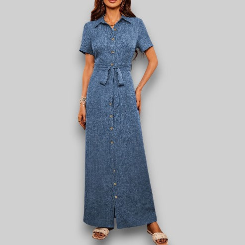 Norfrid kombinerer den uformelle sjarmen til denim med den sofistikerte silhuetten av en skjortekjole. Med knappelukking hele veien, markert midje med knytebelte og et lett, pustende, får du en kjole som passer like godt til hverdags som til en mer pyntet anledning.