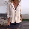 Denne uformelle blazeren har en forsiktig scalloped kant og en avslappet en-knapps lukking. Den brede kragen og 3/4 rullede ermer skaper et avslappet, luftig utseende, mens frontlommer med klaff gir praktiske detaljer. Et snev av kontrastbånd ved halslinningen gir en subtil, stilfull finish.