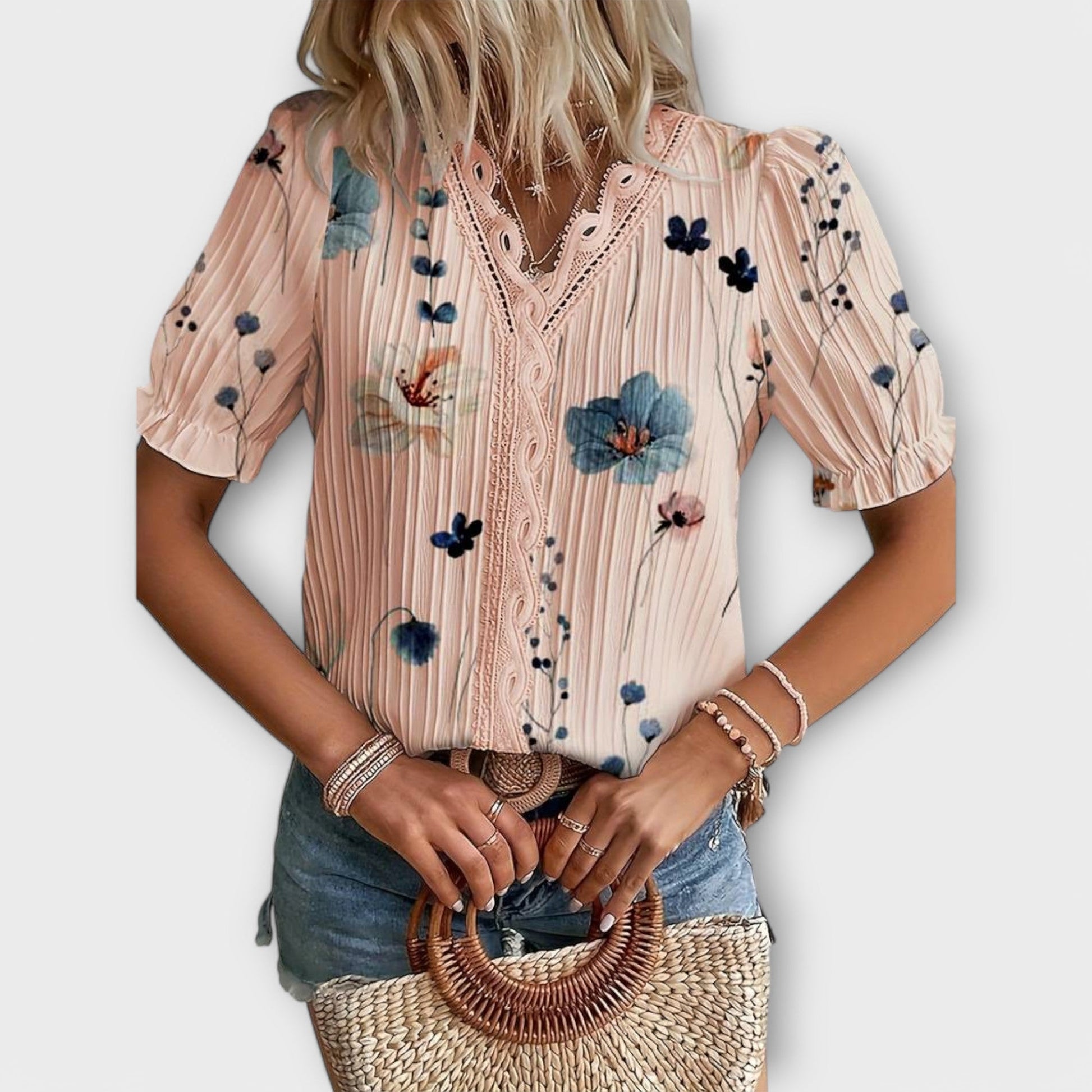 Thyra-blusen er det perfekte valet når du vil kjenne deg fri, stilfull og komfortabel – utan anstrengelse. Den elegante V-halsen framhevar dekolletaget på ein diskret måte, og den luftige passforma gjer henne ideell for vårdagar, kvardagsplanar og uformelle møte.