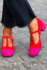 Torhild | T-stropp pumps i rødt og rosa med blokkhæl